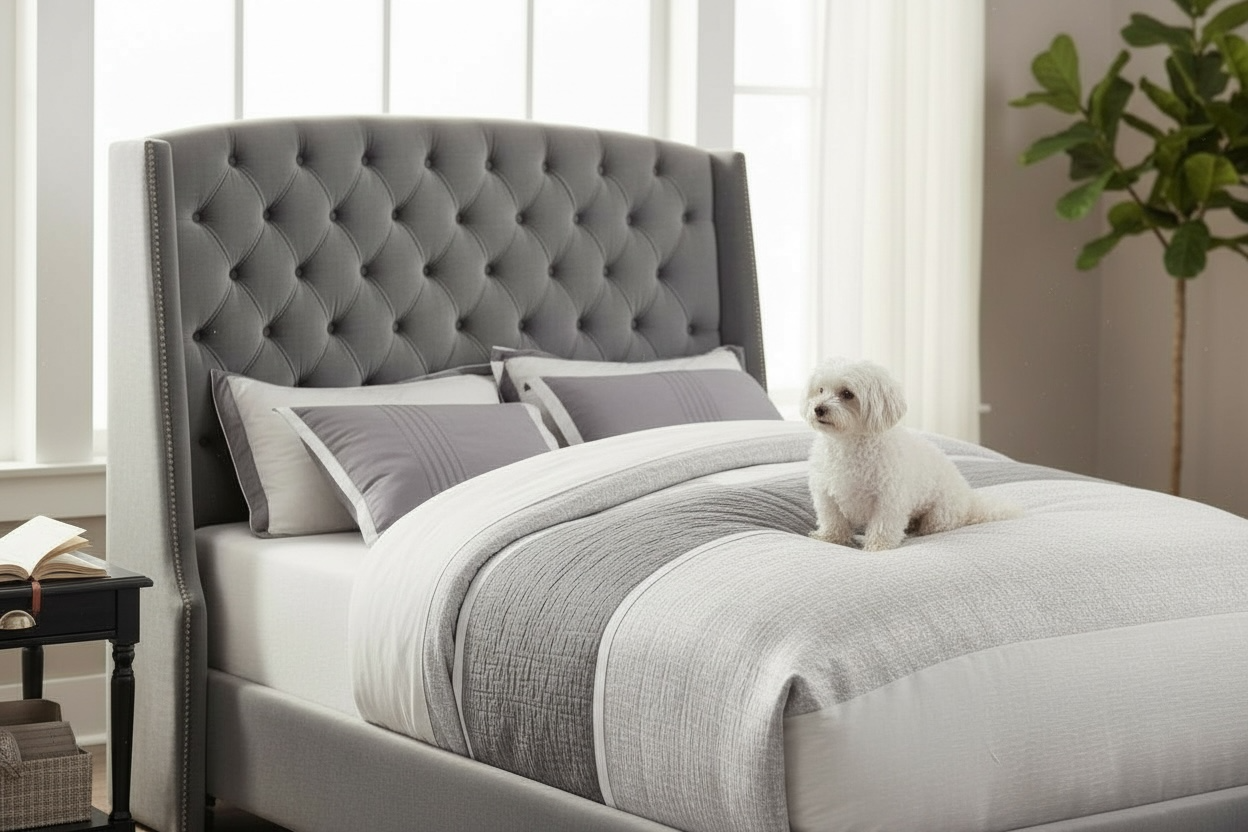 - Bed in image 1 is cream plush, image 2 is grey plush